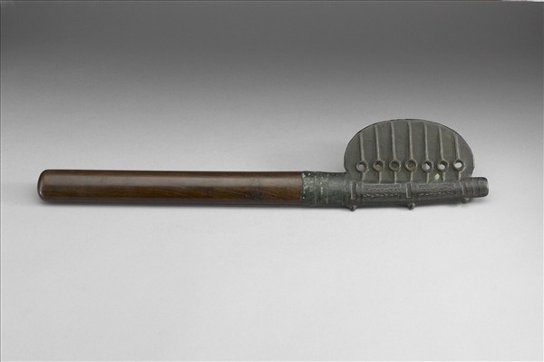 全器由長達18.7公分的管銎,及半圓形帶有邊刃的器身所組成。管狀銎上細下粗,下銎孔徑約為上銎孔徑的兩倍,似有助於固定穿入銎孔的木柲。本器木柲可能於清宮舊藏時加工。花紋主要集中在管狀銎上:銎上有三道箍狀裝飾,中間飾有兩大節點狀紋及鋸齒狀帶紋,背部各有小突起,三個小突起連線下延,隱約可見範線痕跡。鉞身近管銎處有七個圓孔,向刃邊及銎孔邊各伸出突起線,皆為富北方特色之紋飾。