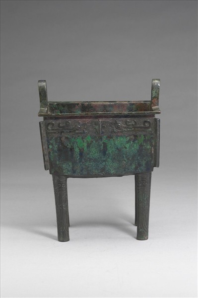 方鼎,盤口,立耳,平底,柱足,有棱脊。腹飾鳥紋,以雷紋為地,足飾蟬紋。外底似有範線。器內有銘兩行七字:「𠂤作□仲寶尊彝。」