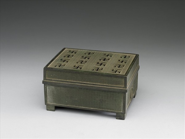 此器為帶蓋方爐,平底,四角有足。蓋面為「卍」字鏤空,器身飾規整細密的回紋,兩側有獸首銜環浮雕。器底有款。 明代高濂《遵生八箋》〈論新鑄仿造銅器〉提到元代姜娘子所鑄銅器以撥臘法製作,煉銅純淨,花紋細巧。器表的深臘茶色,在當時頗受喜愛。《長物志》論香爐等次時,稱「宋姜鑄亦可」。合觀兩則品鑑意見,表現了兩書跨越的三十年間,對此類器物年代的認識由元代轉為宋代。本器底款所稱年代、作者為南宋紹興年間姜氏,其製作年代或與《長物志》相當,或在其後,是為滿足市場需求而製作的托古作品,供日常焚香所用,而非銘文所述之壇廟祭器。
