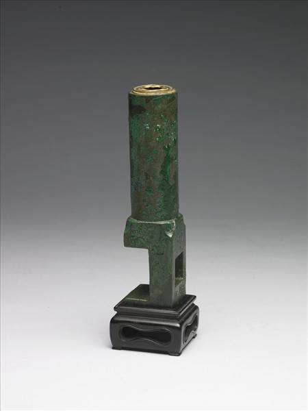 銅質,下半部為圓筒狀,外側刻銘一行二十字,清宮將其倒置增附銅膽,上半則有方形鏤空,似可供接合卡榫之用,或是大型物間中的一個組件。附木座,銘文「乾隆御玩」、「漢帳構」。