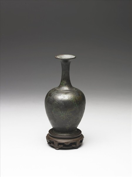 色近黑褐,間帶銅綠,侈口長頸,碩腹,圈足外撇,全器光素無紋,惟器肩部飾弦紋一道。附木座,銘文「乾隆御玩」、「漢素瓶」。