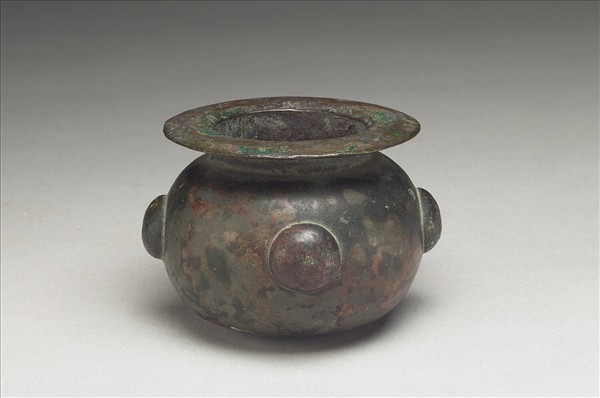 青銅器,呈暗褐色,有綠色及暗紅色銹斑。唇有寬折邊,頸微歛,圓鼓腹,平底。全器樸素無紋,亦無明顯范線痕跡,唯腹上飾四枚圓形凸起,一枚已脫其半,由此可見此飾物為空心造作。器外底遺有一圈環形痕跡,應原焊有一環形物體,或是圈足。