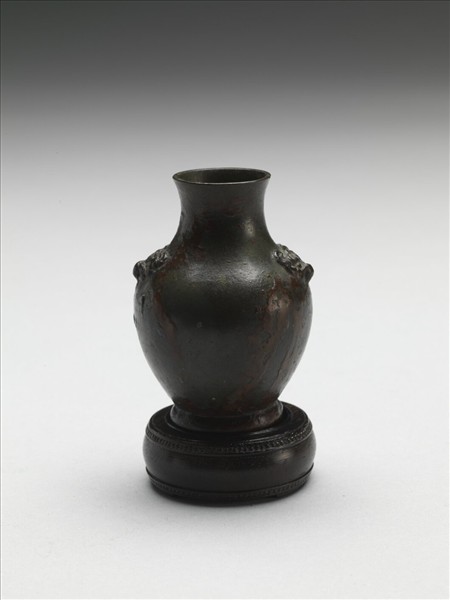 此器收儲於「紫檀嵌彩瓷博古圖小櫃」。 侈口,頸略縮,斜肩鼓腹,圈足微鼓。肩上兩側設獸面鋪首,全器素面無紋。附木座。