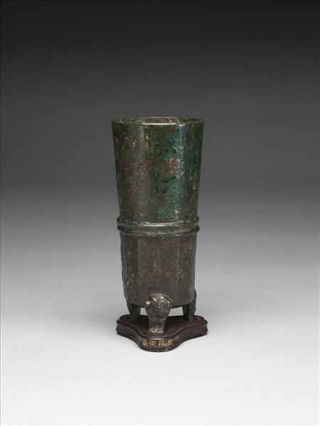 器物改製自西周的車馬器「軎」,是安裝在車輪兩側固定車輪位置的部件。自宋代以下,以至明清,對於車馬器的知識均十分有限。由於不知道這類器物的用途,因此往往憑想像與臆測改製成各種器物。本件器物即為一例。改製者將兩側用以插梢的方孔填實,並在下方加上三足。從乾隆名其為「熊足鐓」可知,改製後的器物被認為是兵器的部件,並加配木座。