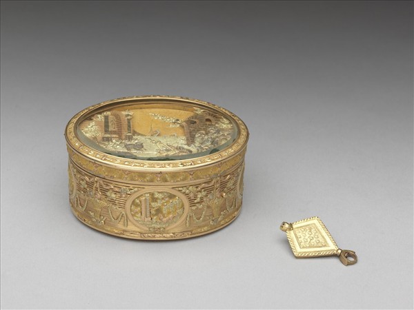 在十八世紀末,有自動機關的機械音樂盒,十分受歡迎。這件橢圓雙面掀蓋鼻煙盒以多色金雕製成,正面掀蓋為可上發條的音樂盒,底面掀蓋為儲存鼻煙的空間。音樂盒面的透明玻璃蓋打開兩側刻有古建築,湖邊野餐的男女正逗弄小狗,一旁有羊兒、狗兒趴著休息,中間有天鵝一前一後,旁有鎖孔,轉動發條後,可看見湖上天鵝悠閒划水,遠景則淺刻屋宇天際。盒四周開光雕風景,餘飾花籃花串;底蓋亦刻男女嬉戲。全盒以多色金雕製成。據戳記外盒由法國巴黎金匠Joseph-Etienne Blerzy製作。