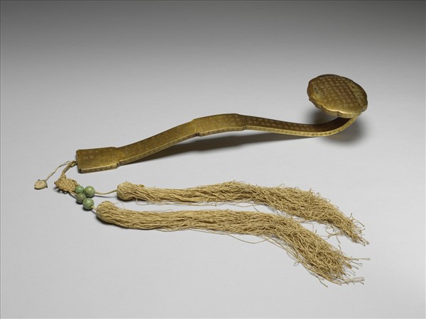 銅鍍金如意,雲葉式首、柄中央隆起,腹與趾均作長方,繫雙穗。全器除邊側飾回紋外,首與柄之表面與底面,均滿刻漢字隸書之金剛經經文。有「莊嚴淨土分第十 」、「無為福勝分第十一 」二段,穗上亦繫桃形小香絆,書「卯」字。