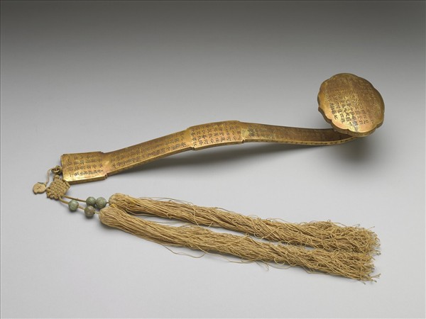 銅鍍金如意,雲葉式首、柄中央隆起,腹與趾均作長方,繫雙穗。全器除邊側飾回紋外,首與柄之表面與底面,均滿刻漢字隸書之金剛經經文。有「法會因由分第一 」、「善現啟請分第二 」、「大乘正宗分第三」、「妙行無住分第四 」四段,穗上亦繫桃形小香絆,書「子」字。