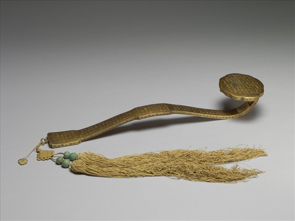 銅鍍金如意,雲葉式首、柄中央隆起,腹與趾均作長方,繫雙穗。全器除邊側飾回紋外,首與柄之表面與底面,均滿刻漢字隸書之金剛經經文。有「究竟無我分第十七 」一段,穗上亦繫桃形小香絆,書「未」字。