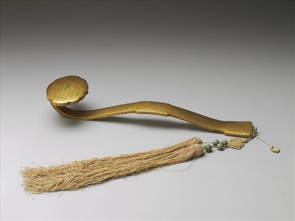 銅鍍金如意,雲葉式首、柄中央隆起,腹與趾均作長方,繫雙穗。全器除邊側飾回紋外,首與柄之表面與底面,均滿刻漢字隸書之金剛經經文。有「持經功德分第十五 」、「能淨業障分第十六 」二段,穗上亦繫桃形小香絆,書「午」字。