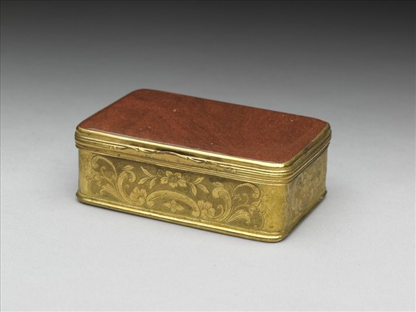 長方掀蓋銅盒,盒蓋嵌金星玻璃,盒壁四面與盒底鏨刻卷草花卉。此件原存放在多寶格中。