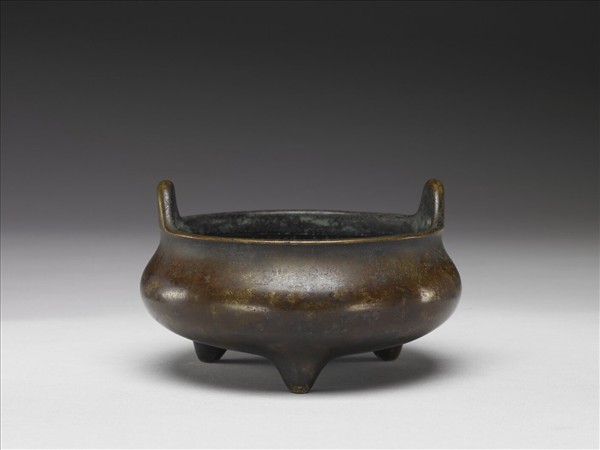 口微侈,扁碩腹微向下垂。底部呈優美的弧面,三乳足。兩立耳,耳部呈拱橋形,弧線與口際連成一氣。耳部由細窄的口邊逐漸加厚,至頂端厚實如稜。此銅爐爐身重,外表表面黃、褐紅交織斑爛。器底有陽文楷款,「大明宣德年製」六字三行。