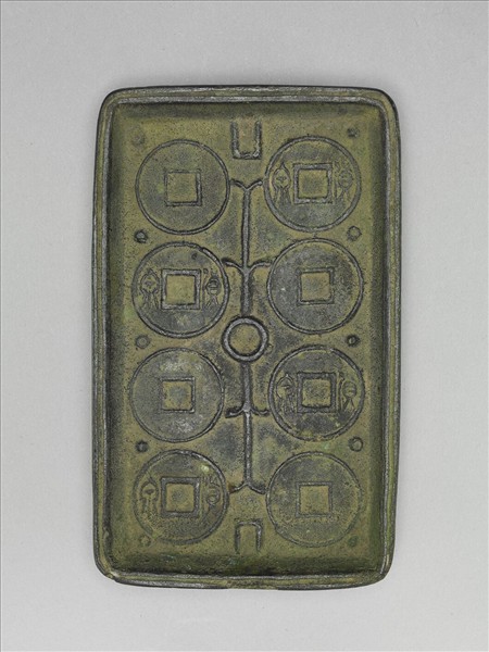 折沿,淺直壁,矮方足。器內陽刻八枚方孔銅幣雙行並列相連,兩兩擬錢範之正反面。左方第二、四個,右方第一、三個銅幣,有陽文懸針篆「貨泉」兩字。器底陽文款八字雙行「保定元年總管府造」。