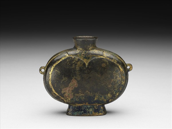 扁壺,圓口、短頸、扁腹、方圈足,器肩兩側有附耳。通體鎏金。