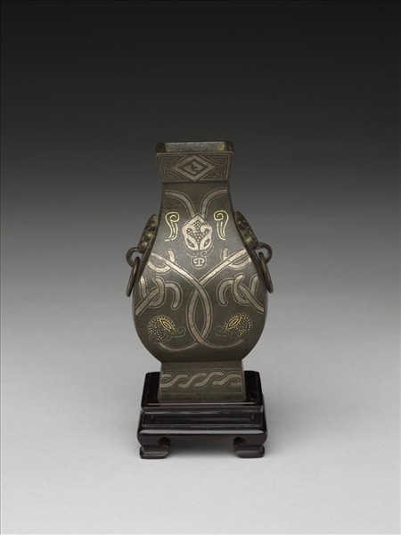 以古銅器為造型,紋飾如繩結,幾何中帶著隨意的組合方式,錯金銀線條清晰。鈁器形原多大者,此則縮小,以置几案玩賞。