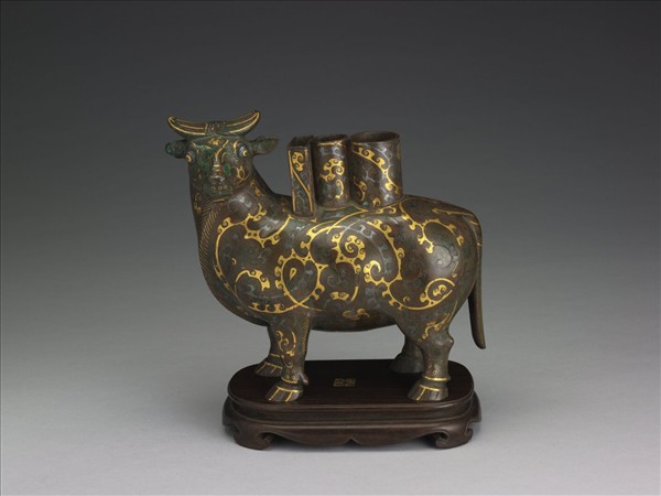 本件著錄於《西清古鑑》,作「唐犧形表座」。整體為牛形,表面以金銀鑲嵌雲雷紋為飾,背上開三孔,不知用途為何。從表面金銀脫落處看來,嵌槽很淺,推測應是將金銀調成泥狀,塗敷於嵌槽上。表面曾經處理,呈均勻的赭褐色。清宮稱此件器物為「唐犧形表座」,原來陳設於養心殿,英國的Victoria and Albert Museum也藏有一件乾隆仿製的琺瑯器。此造型的牛形犧尊與江蘇邗江出土的漢代錯銀牛燈相近,可能仿自類似的出土器。