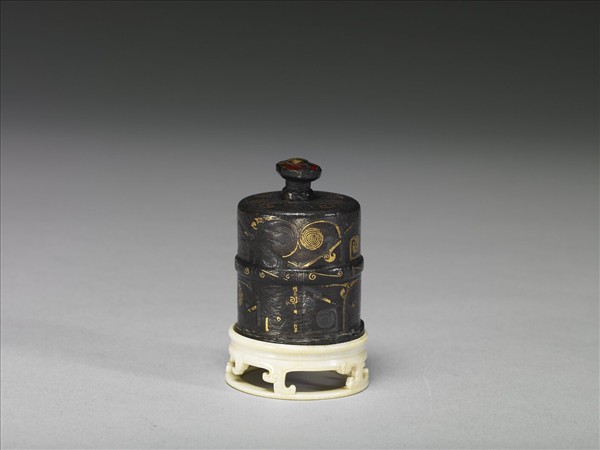 原為戰國嵌在車馬木軸上的圓筒狀飾件,上飾雲紋渦紋的幾何紋,製作精緻,經過改裝,加上底,頂另加中空銅滴柱,作為硯滴。晚明人以銅質為雅,勝於玉、瓷等材質,或不詳古人的用法,或無可用處,視其甚精,往往加上己意改製,正說明其對古的態度。