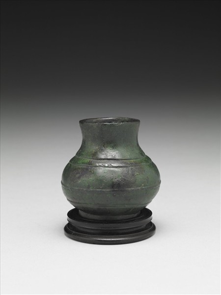青銅小壺,頸部以上殘斷經修整。短頸,溜肩,圓腹,腹間飾二道弦紋,器表帶青綠色銅鏽,色澤古樸。尺寸小巧,為多寶格貯件之一。