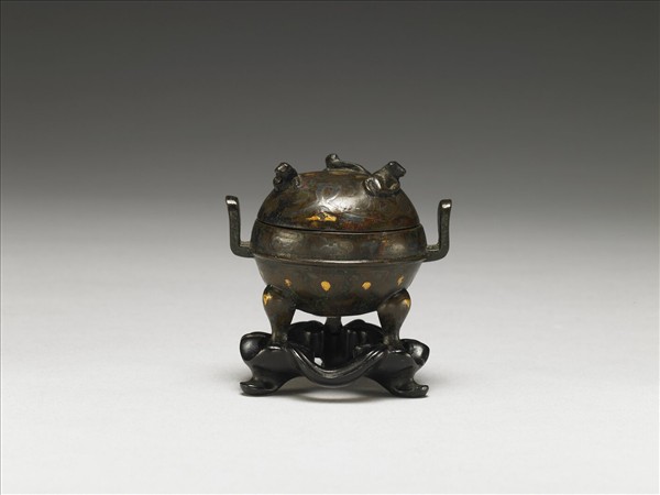 器仿戰國時代三犧鼎,帶圓蓋,其上鑄三犧,器兩旁有立耳,圓腹,三蹄足。腹間飾一道弦紋,器身飾錯金銀紋樣,蓋嵌幾何圓渦紋,口沿飾一圈山形紋,弦紋下以銀線嵌三角紋,並內塗金泥點綴。明代尚古,多見仿商周器形及花紋的青銅器,到明晚期更流行此種錯金銀的裝飾。本件尺寸小巧,色澤古雅,為明清時代仿古銅器,現儲於多寶格中。