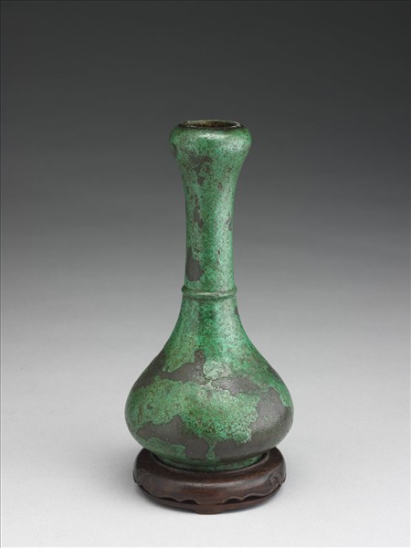 此器與西漢流行的蒜頭壺整體相似,只是未見壺口的蒜瓣造型。清宮所配的木座題名曰「漢溫壺」,可能是認為與溫酒的功能相關。
