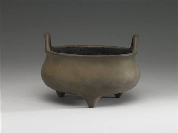 撇口,束頸,雙立耳,鼓腹,三足。通體呈古銅色。器底帶一方框,內有陽文雙行直向款「大明宣德年製」。