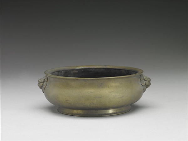 撇口,束頸,龍首耳,鼓腹,撇圈足。全器通體呈古銅色,惟器底墨黑。底部陰刻方框,帶六字直向楷款「大明宣德年製」。
