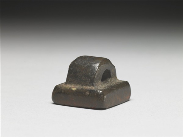 銅質方形印章,帶一瓦鈕。印章表面斑駁,凹凸不平。印面陰刻「軍假司馬」。印面與字體凹槽間可見朱紅印尼。附黃籤,書「乾隆五十七年十二月初三日(1793)收造辦處呈覽銅圖章一方」。