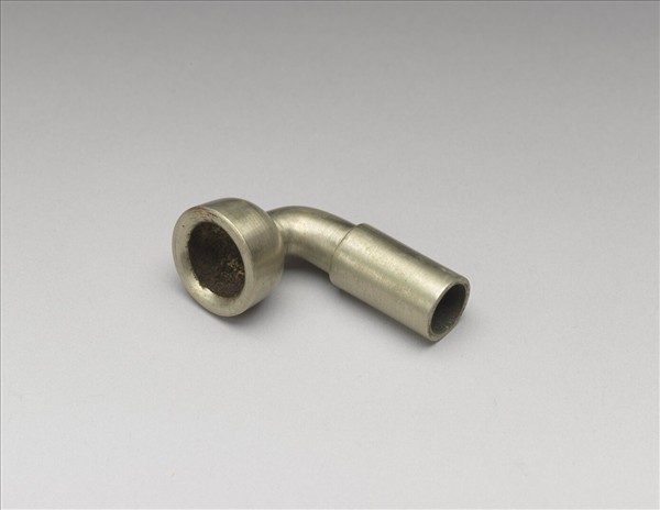 銅煙鍋,外壁光素無紋,白中透黃。整器樣式簡潔,猶如用三段大小長短相異的金屬管相接而成L形。短而徑大的部份還看得見使用痕跡,其外壁鏨刻「上盛德」三字。