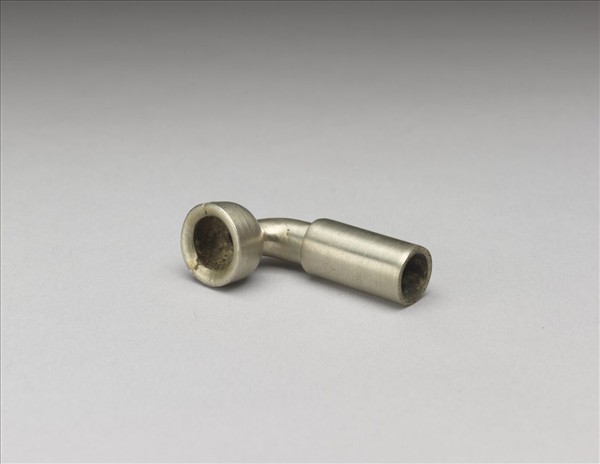 銅煙鍋,外壁光素無紋,白中透黃。整器樣式簡潔,猶如用三段大小長短相異的金屬管相接而成L形。短而徑大的部份還看得見使用痕跡,其外壁鏨刻「王天成」三字。