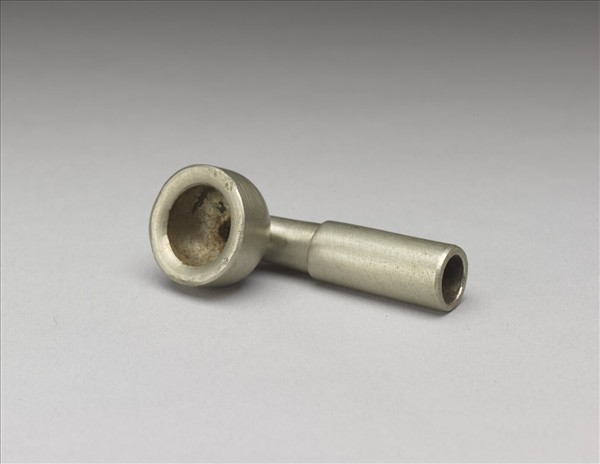 銅煙鍋,外壁光素無紋,白中透黃。整器樣式簡潔,猶如用三段大小長短相異的金屬管相接而成L形。短而徑大的部份還看得見使用痕跡。