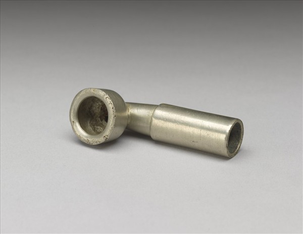 銅煙鍋,外壁光素無紋,白中透黃。整器樣式簡潔,猶如用三段大小長短相異的金屬管相接而成L形。短而徑大的部份還看得見使用痕跡。