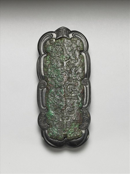青銅,近長方形,長邊外廓有有四小方形凹入,短邊一端有方形凹入,一端略成尖角,面上夔紋,面上大部分覆有銅綠,雖古意盎然,但紋飾已較模糊,附木座。