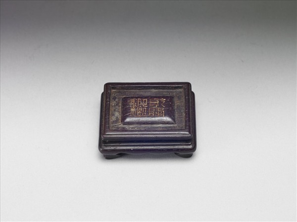 四角形木座,束腰四足,座面中央四方形凸起,上刻「乾隆御鑑」雙行四字篆款。座底刻「漢獸耳方壺」填金楷字。