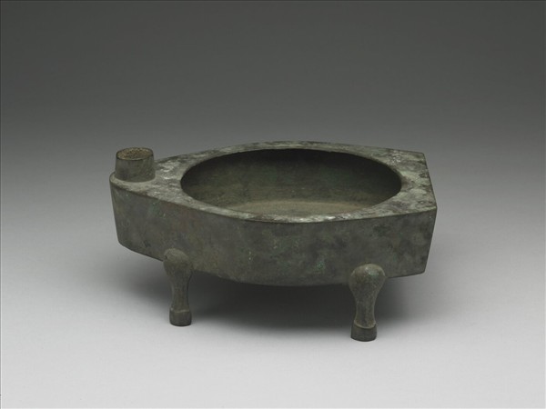 銅質,器表全為銅綠沁。舟形,如欖核形但一端截平,器面與側各有一圓、長方形開口,銳端側面焊有短柱,平底,下接四獸形足,全器光素無紋。本件形仿漢灶但體型嬌小,本為明器,但灶口被切割改作,在清宮作暖硯用。