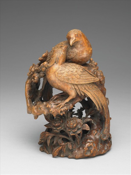 全器取一段粗實竹子的地下莖,圓雕出二綬帶鳥棲息於梅樹幹上,二鳥一上一下四目對視,雙喙相接。枝幹上朵朵梅花或盛開,或含苞,另有菊花、牡丹等散佈粗幹四周。「梅」與「眉」同音,綬帶鳥又名「壽帶」,合稱「眉壽」。凡人年老者眉多有豪毛秀出,故稱人老壽曰「眉壽」。《詩經‧豳風‧七月》有句:「以介眉壽」。清初嘉定竹刻有一類系統是取竹子的地下莖,「就其高卑、曲折、淺深之宜,刻為人物、山水、果蓏、花卉」,後來逐漸發展出具吉祥語意的立雕作品,竹人選材、度材後奏刀,總需匠心獨具地雕製出雅俗共賞的作品。降及清晚期嘉定地區竹人將這類利用竹子地上莖製成筆筒、詩筒、煙筒或臂擱等器類作品,稱為「小件」;而將利用竹子的地下莖圓雕成人物、動植物等立體作品,稱為「大件」,又名「件頭」。並且稱能雕製大件為「會大刀」,能雕製小件為「會小刀」。