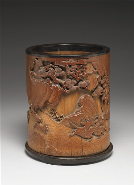 筆筒以竹雕刻而成,鑲深棕色木口與底座,底帶三矮足。器表周飾蒼松與峻石與一隊人馬狩獵圖。狩獵大隊紛紛手持旌旗與各式武器,騎乘駿馬追逐獵物,獵犬尾隨其後。兔、鹿皆飛奔逃竄。全器以高浮雕、淺浮雕與淺刻技巧雕刻而成。