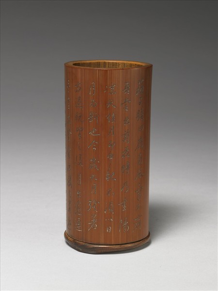 全器截取竹子地上莖兩節間的一段,經整治與刮磨稱為「竹青」或「青筠」的表皮後,以大字深刻技法陰刻行書北宋蘇軾所作「江月」五言詩的詩引,然後另配以木質器底。所刻詩引本文十行,後接二行款識,全文如后:蘇子瞻曰:「嶺南風氣不齊。吾嘗云:菊花開時乃重陽,涼天佳月即中秋,不須以日月為斷也。今歲九月,殘暑方退,既望之後,月出逾遲。予嘗夜登合江樓,與客遊豐湖,入栖霞禪寺,扣羅浮道院,登逍遙堂,逮曉乃歸。杜子美云:四更山吐月,殘夜水明樓。殆古今絕唱也。」另低兩格陰刻行書款:「舜江王永芳錄於一枝居。」清嘉慶十二年(1807)金元鈺《竹人錄》專載嘉定竹刻藝術,上卷收錄了嘉定竹人王永芳,曰「王永芳字玉斧,自署舜江,工鐫字,墨守蘇文忠清勁洒落」。也就是說,王永芳擅長竹刻藝術中的陰刻文字,所作字跡總能展現出蘇東坡書法藝術的「清勁洒落」韻致。這件文字筆筒壁面所錄是蘇軾五首「江月」詩的引言,蘇軾生長於四川,對於熱帶或亞熱帶的嶺南氣候較陌生。蜀中菊花綻放於九九重陽前後,八月中秋時節天候已涼,但是嶺南遲至農曆九月,殘暑方退,此時月亮升起的時間也晚。雖然如此,蘇東坡反常於半夜起身,或游於江湖之上,或造訪寺院,不亦快哉!嘉定竹人陰刻文字,清前期所作者字體較大,清代中期日漸趨小,其他地區則有不少擅長篆刻的文人或印人以業餘之姿參與竹刻藝術之創作,其所作陰刻文字多偏小字,此時已不易覓得如王永芳這件筆筒上的文字般的長篇大字者!