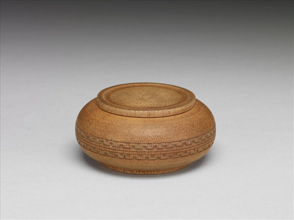 全器以竹雕刻而成,斂口,圓腹,平底,帶平頂蓋。全器淺棕色,以陰刻技法於腹部飾兩圈幾何紋飾。
