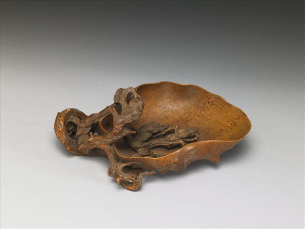 竹根雕成水盛,側面雕古松虯枝,攀附錯落於器緣,或屈伸入水盛中,器底雕鱗皴癭結與竹根紋理相融合,展現古松蒼勁的美感。