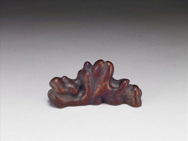 筆架以木根雕刻而成,以圓雕技法雕刻成山字形,為連綿之三座主要山峰,器表凹凸不平。器色棕中帶紅。