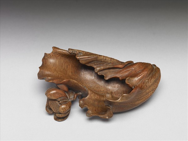 竹根雕一片捲曲的荷葉,另雕盛開荷花一朵自葉緣伸出,雕工渾圓且細節講究,造型頗具動態,彷彿荷葉正迎風搖曳。為極精好的文房雅玩。