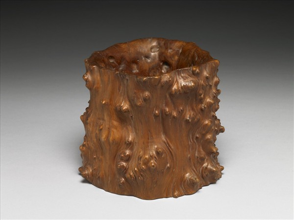 筆筒用樹根隨形雕刻而成,底平,底部漆為深黑色。筆筒中間挖空,器表樹瘤密佈。器色棕紅。