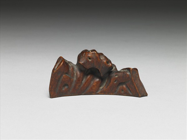 筆架呈山字形,為連綿之三座山峰。器色棕中帶紅,以圓雕技法雕刻而成。