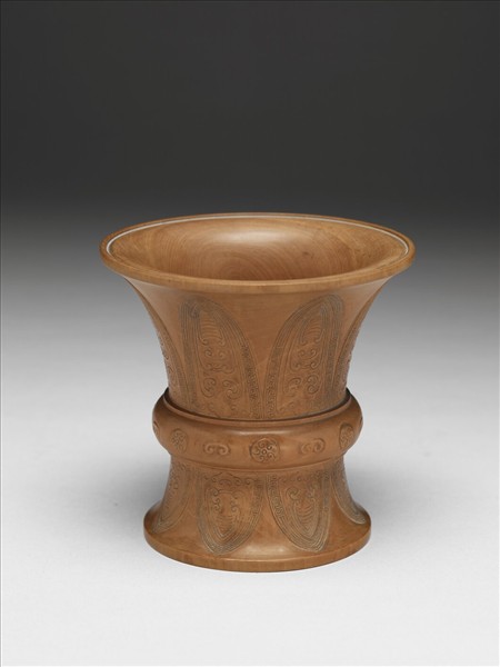 侈口,腹部下端外撇,底內凹,中腰凸出一圈。全器乃取一整塊木剜掏內膛,略仿商代銅觚形制製成。中腰凸起部分淺浮雕一圈圓渦紋(又稱「冏紋」),兩個圓渦紋之間飾一鉤雲紋;中腰凸起部分彷彿商代銅觚之腹部,其上下部分似銅觚之脰部與腹部,後者淺浮雕蕉葉蟬紋。清代乾嘉之際,金石學興盛,不但藝匠選用竹材摹刻金石,影響所及,亦見以木為材者。自明晚期以來,商代銅觚形制最常被仿製,或以瓷塑,或以竹木雕製,也見銅胎琺瑯器者。這件則取整木雕製,但見匠心仿古而不溺古。形制上藝匠僅取觚之外形,未曾留下銅觚之高圈足,紋飾上亦加變形,蕉葉形與蟬紋既仿古,又見新意。