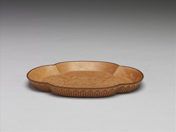 以淡黃色木雕刻之海棠式盤,撇口,淺壁,平底。外壁以竹黃條作蓮瓣式圖案。內底貼竹黃片,淺雕磬、卍字、雙蝙蝠與雙魚圖案,魚口啣綬帶。盤內壁雕刻松、竹、梅蘭圖案,取其「萬福慶有餘」、「歲寒三友」之吉祥意涵。