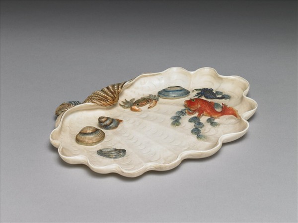 半面蚌形,侈口,淺壁,平底,內側浮雕染色金魚、水蠍、螃蟹、牡蠣、蛤、蚶、螺獅等各一,綠色水草一組,蚌蟹間並有小螺獅一,用於承裝之貝殼僅於根部上色,其餘留白,雕貝殼紋路。