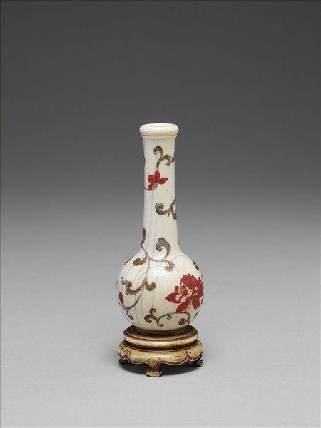 唇口,直長頸,圓腹,圈足,三足如意雲足座。由象牙一體雕成,仿瓷器形制,瓶上有開裂紋,以紅褐彩繪轉枝花葉紋,座以紅彩框邊,內填褐彩。
