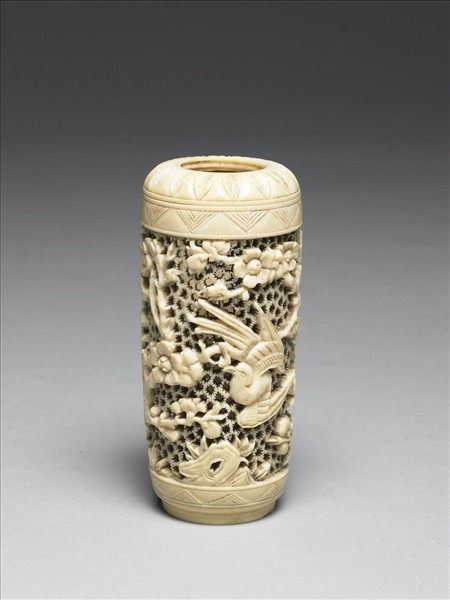 全器為象牙雕成,飾蕉葉紋的一圈可拆離。折開口圈,器身就呈直筒狀。直筒的上下端飾尖角紋,外壁飾縷空之冰紋錦地。錦地上為凸雕之梅樹、山雀。原應有木座及木蓋,現佚不存。此香筒內有薰燒的使用痕跡。