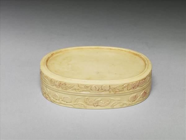 橢圓形扁盒,子母口,蓋頂光素無紋,緣邊起棱,蓋側壁與盒側壁以淺浮雕刻一圈桃枝桃實紋及蝙蝠紋相間紋飾,代表福壽之意。