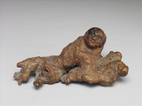 整器就自然木根之原始樣貌,略施裁切磨光而成形,故整器瘤節木紋皆在,而加工雕作處有二,皆雕為人面,其一高額大耳,兩眼圓睜,抿唇前視;另一頭臉尺寸較小,亦作高額睜眼前視之貌。由於木根可橫向平放,遂使整器如一人側身臥躺,而一小兒在旁之態。