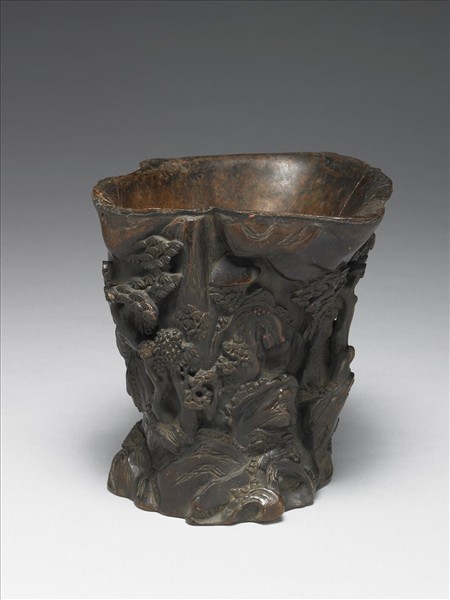 用沉香木隨形雕刻而成,以高浮雕與淺浮雕相互運用,雕屋舍於層巒山石與鬱鬱林木間,兩件一對,同樣作為陳設器。沉香取材不易,又為成對雕件,可見宮廷陳設之奢華。北京故宮見有類似藏品。據《點查報告》此對原出於敬事房,或為《宣統十四年‧敬事房小漆木器實存》之「沉香鑲銅裏筆筒一對」。